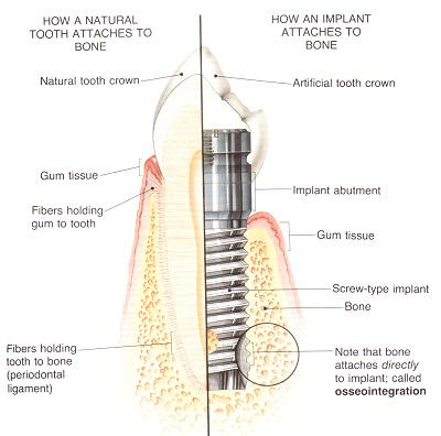 The key to the success of all implants is a process called osseointegration, in which the bone in the jaw bonds with the implant. Titanium is a special material that the jawbone accepts as part of the body. The ability of titanium to fuse with bone was discovered accidentally. In 1952, a scientist named Per-Ingvar Brånemark was using titanium chambers screwed into bones as part of his research to discover how bone healed after an injury. When he tried to remove the titanium chambers, he found they had become bonded to the bone. This discovery led Dr. Brånemark to do further research into how titanium implants might work.